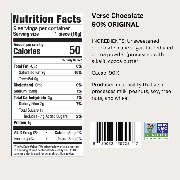 Crafting a 90% dark chocolate with only the highest quality cacao beans, creates a smooth and velvety taste normally attributed to a 70% chocolate, but with much less sugar.