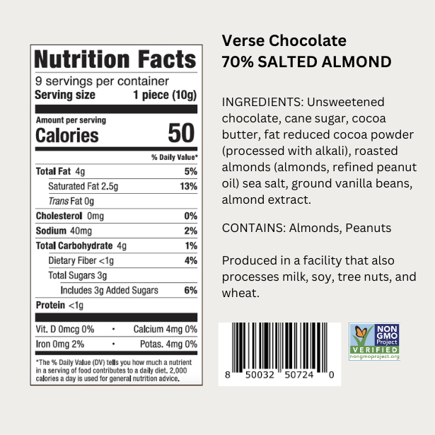 Two of our best-selling products bundled in one. Our 70% Sea Salt offers a bold, rich balance of cocoa enhanced with a subtle tang of sea salt. Our 70% Salted Almond adds the savory and satisfying crunch of roasted almonds.
